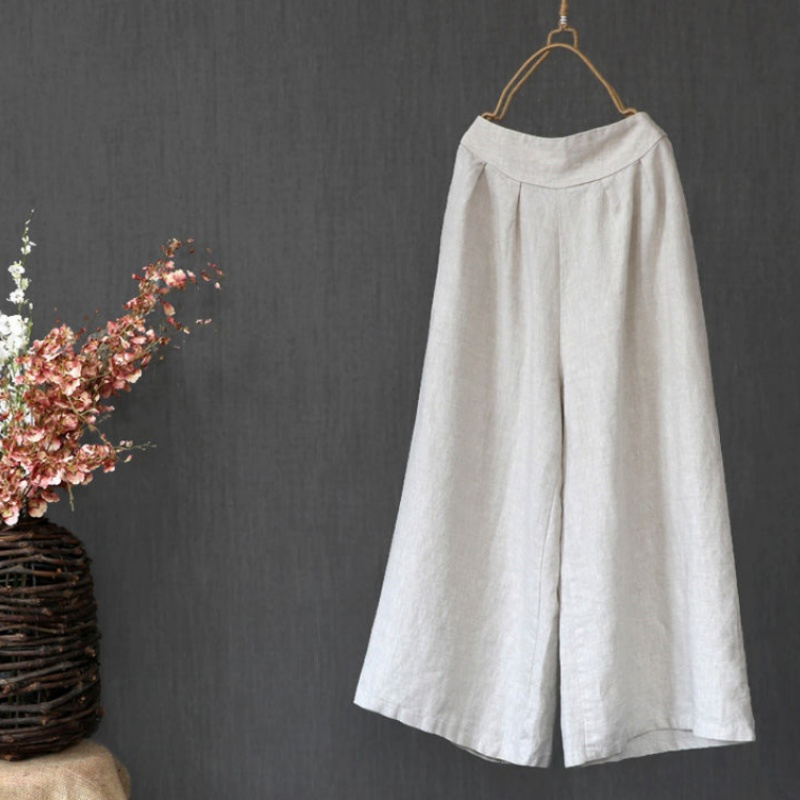 กางเกงขาบานผ้าฝ้ายผ้าลินินเอวสูง